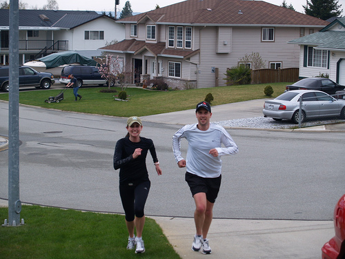 Not even an Easter long weekend at home in Powell River could have stopped my brother and I from sticking to our rigorous training schedule. We ran a 14 mile /23 km run that took us all over town, up and down hills, through bushes and trails, and also through a lot of different neighbourhoods that brought back a ton of memories. My mom also even came for a short portion of the run with us! (She’s training for her 15th consecutive Vancouver Sun Run) Although we have run longer distances, this run, on different terrain, caused us to be a little more stiff and sore than usual. On the home stretch, my brother Wes caught a few pictures of Jordan and I running up our street. Here’s one of them below: